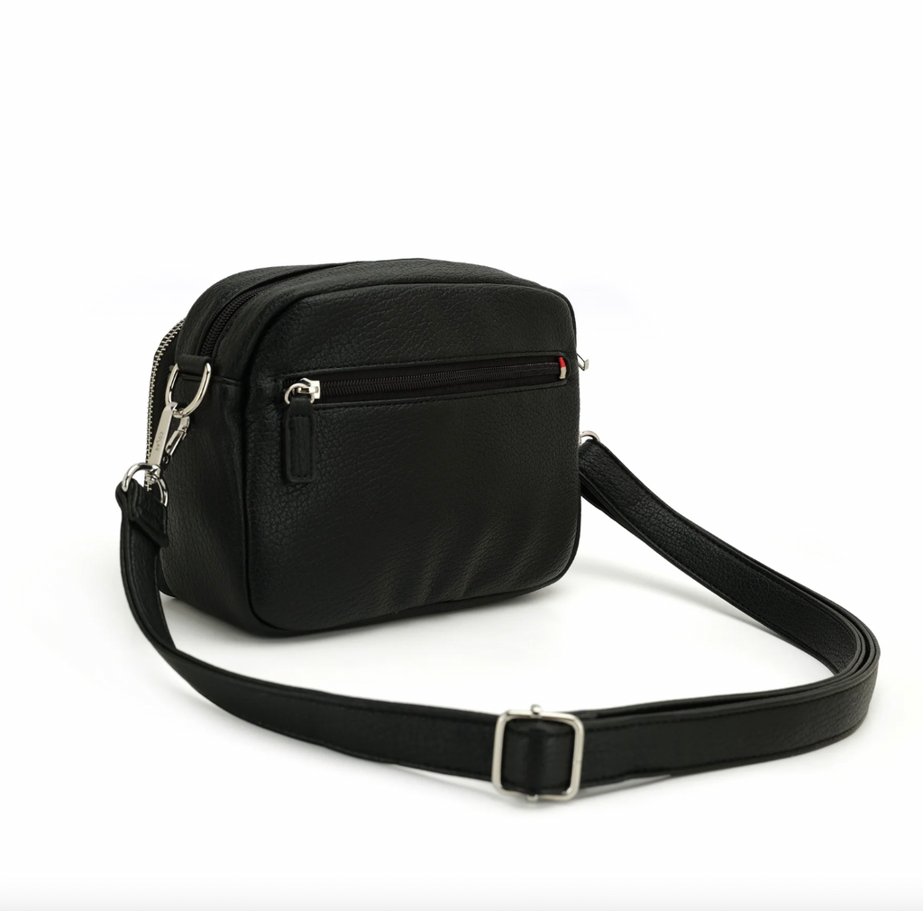Made with recycled textured vegan leather. This bag has a top zipper opening, front zip pocket and a slide pocket with a magnet closure. This bag features an adjustable and removable crossbody strap with back zipper.